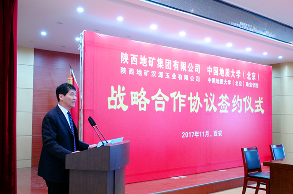 王鴻冰在致辭中說,陜西是中華文明重要的發祥地之一,是全國的科技、教育和文化大省。陜西地礦集團是全國地勘單位深化改革的排頭兵,是陜西地質找礦的主力軍,為建設富裕和諧美麗的陜西做出了突出的貢獻。中國地質大學(北京)是高層次地質人才培養的重要陣地。65年來,不斷地為全國地勘單位輸送了大量的地質人才。同時,學校的發展與行業的發展緊密相連。學校要適應新的轉變,適應新形勢下地質高等教育發展的新趨勢,進一步落實國土資源部“三深一土”科技創新戰略,加強與用人單位間的深層次互動,為地勘行業轉型升級提供智力資源和人力支持。特別是像陜西地礦集團這樣的科技力量雄厚、人才資源豐富、雙方之間合作基礎扎實的地勘企業。此次以戰略合作協議的形式將雙方之間的合作加以固化和深化,為雙方之間的合作提供了新的更好的契機。相信雙方之間一定能夠充分地發揮各自的優勢,將合作領域進一步拓寬挖深,使雙方之間在更廣更深的領域實現互惠共贏,共同發展。